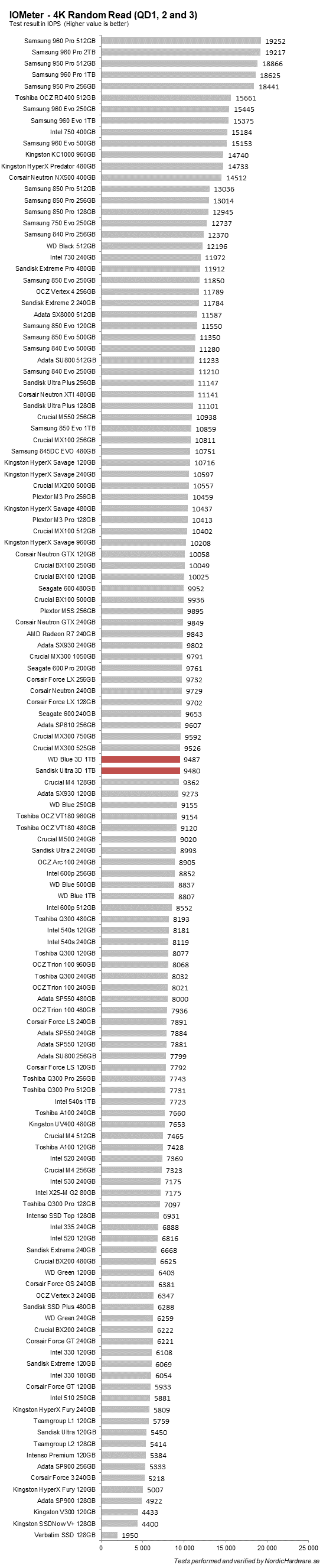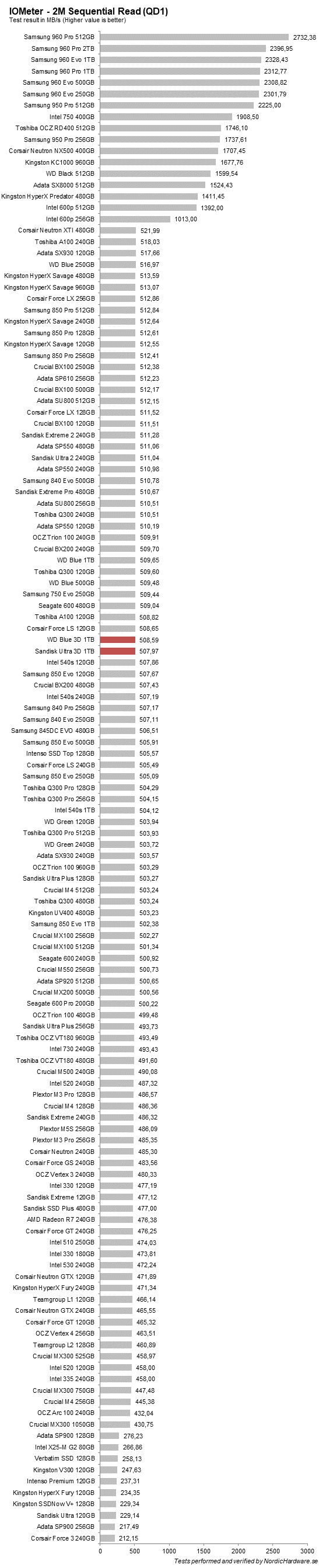 Sekventiell läshastighet säger inte så mycket då alla dagens SATA-enheter är begränsade till 500-550 MB/s.