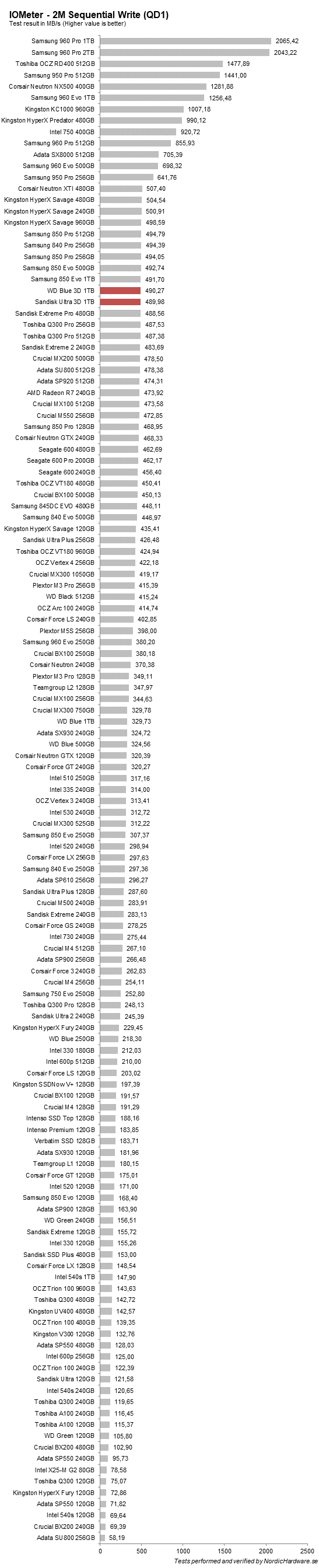 Vid skrivning har det inte hänt något och de nya enheterna lägger sig på samma nivå som WD Blue. Samtidigt är 850 Evo och MX300 är snabbare.