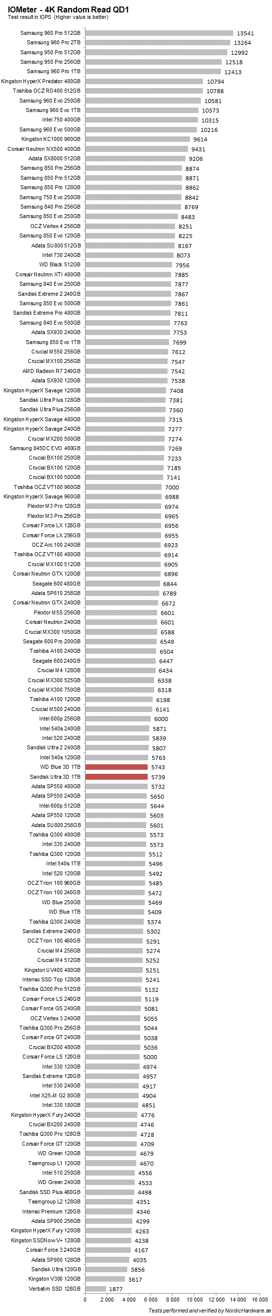 Slumpmässig läsning vid QD1 har blivit lite en av de viktigaste delarna för att mäta konsumentprestanda. I vårt tycke så är allt över 5000 godkänt och allt över 7000 är bra. De två nya enheterna ger oss ungefär samma resultat som WD Blue med ungefär 5700 IOPS.