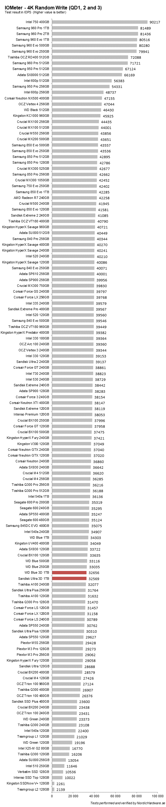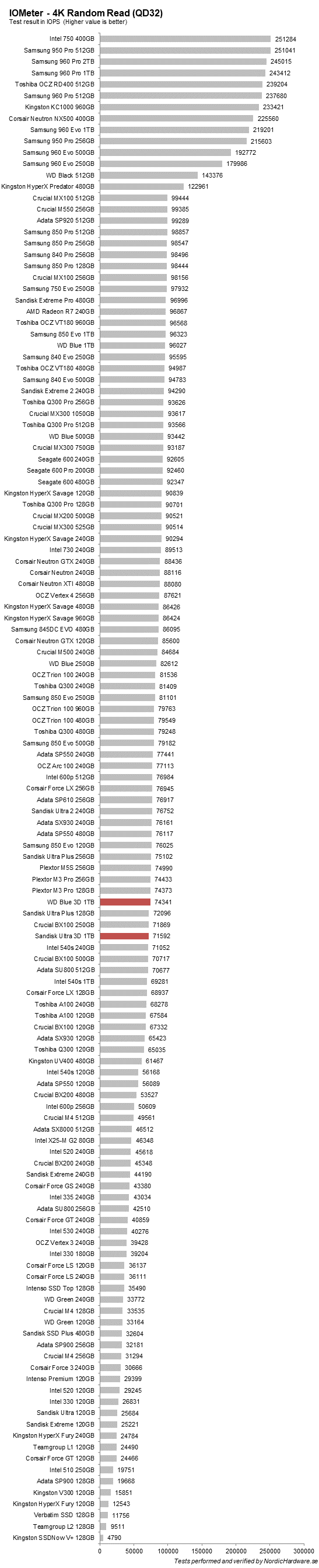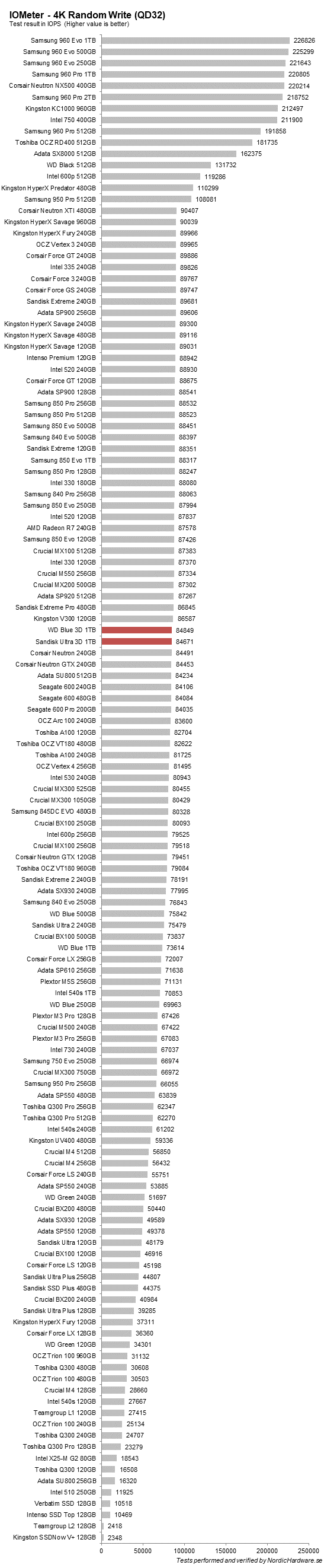 Här ser vi faktiskt en rejäl försämring i prestanda jämfört med föregångaren. WD Blue ligger på 96 000 IOPS medans de två nya ligger straxt över 70 000. Det borde dock inte spela så stor roll då prestanda vid så här hög QD sällan är relevant för vanliga konsumenter.