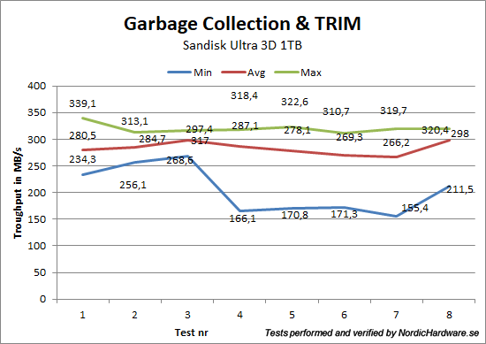 Varje test består av sekventiell skrivning över hela enhetens yta. Från denna tas det fram ett minimum, ett genomsnitt och ett maximum. Här följer hela testförfarandet.