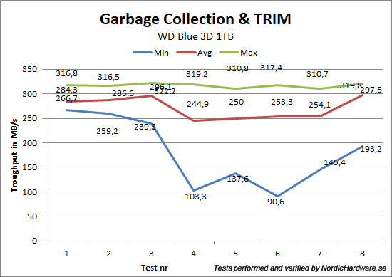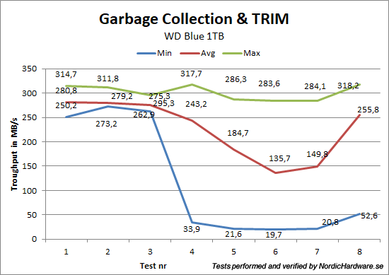 Nu börjar det likna något. Om vi tittar på enheterna livscykel genom vår testsvit så ser vi att WD Blue (högst upp) gradvis får sämre och sämre prestanda vartefter vi fortsätter att skriva data till enheten. Det är inte förens enheten får ligga lite i vila som den återhämtar sig något.