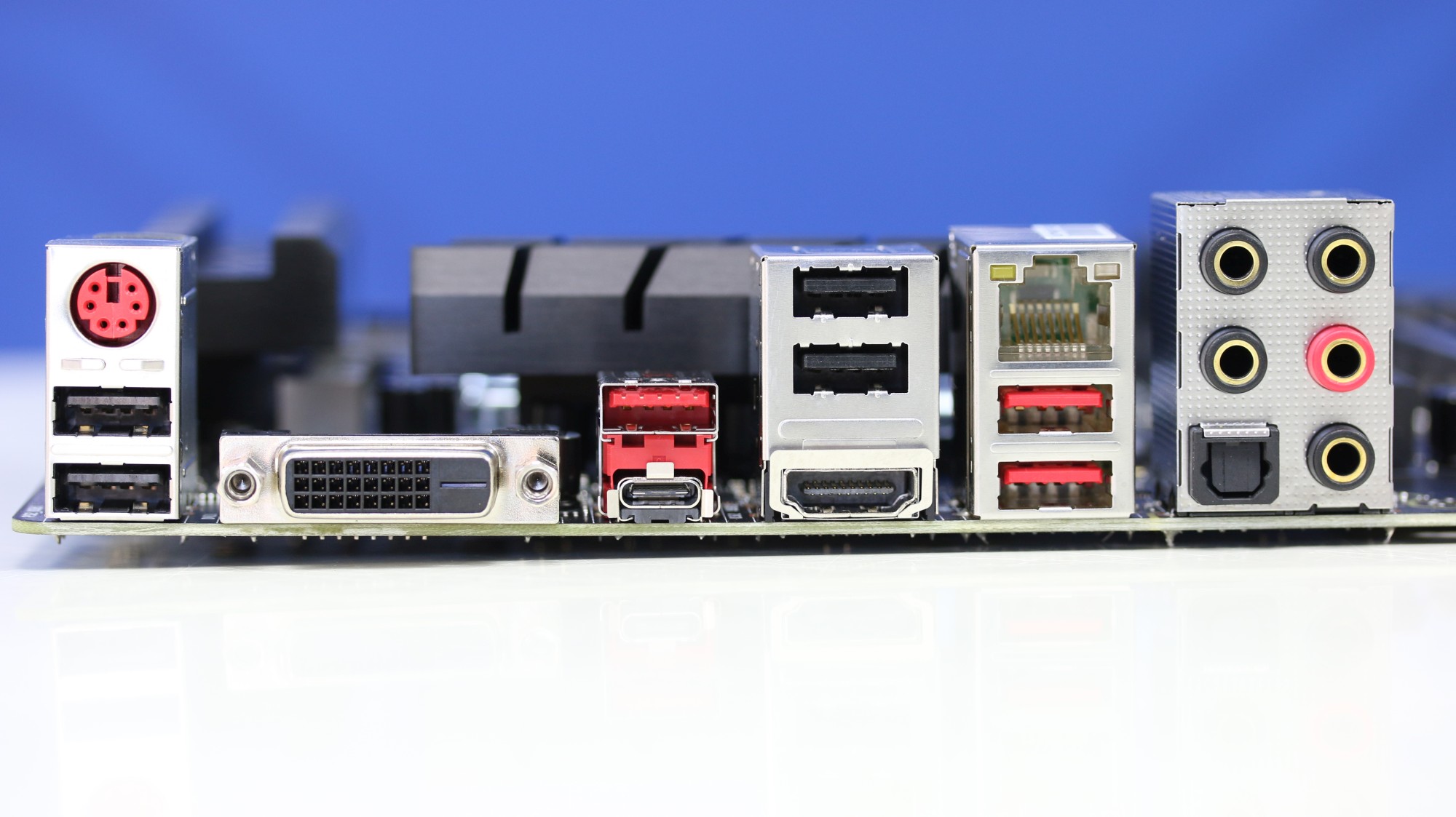 Vid IO-panelen hittar vi totalt fyra traditionealla USB 2.0-portar, som bäst används för möss och tangentbord. Av de övriga tre röda USB-portar som finns vid IO-panelen är två stycken USB 3.0 via Intels inbyggda krets och den sista är USB 3.1 via en styrkrets från Asmedia. Under sistnämnda finns ytterligare en USB 3.1-port i det vändbara USB-C-formatet.