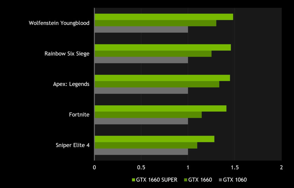 Påståendet stämmer inte ens enligt Nvidias egna diagram. Diagrammen visar till exempel att GTX 1660 Super presterar runt 50 procent bättre än GTX 1060 i Wolfenstein Youngblood. Om vi förutsätter att det är korrekt, innebär det en förbättring på runt 50 procent. Det är en tredjedel av vad Nvidia påstår i sin egen marknadsföring. Det verkar helt enkelt som att Nvidia har blandat ihop två saker: ny prestanda i relation till gammal och förbättring i prestanda. Enligt Nvidias diagram har 1660 Super cirka 50 procent (0,5 gånger) högre prestanda än 1060. Om 1660 Super hade varit 1,5 gånger snabbare hade prestandaförbättringen varit 150 procent, inte 50 procent. Felet blir särskilt pinsamt när samma mening som felet nämns i inkluderar en jämförelse med 1660, där felet inte har gjorts.
