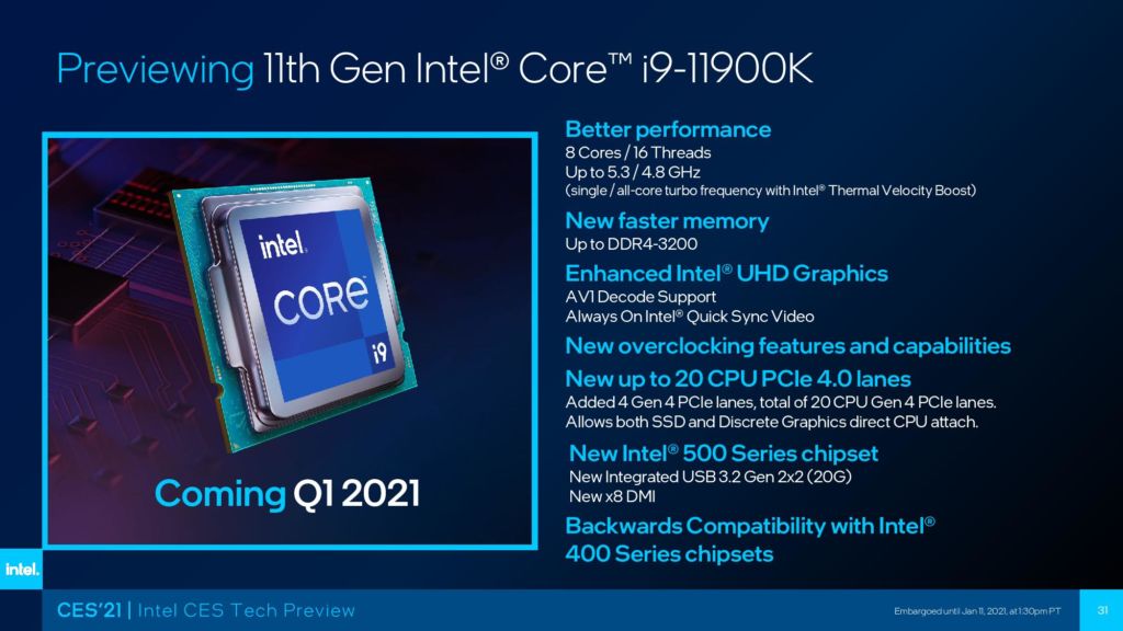 Under gårkvällen höll Intel sin presskonferens i samband med årets upplaga av CES-mässan. Det bjöd på bland annat nya processorer för bärbara datorer i form av Tiger Lake-H. Vi fick även en första smygtitt på den kommande processorserien Rocket Lake-S för stationära datorer och dess flaggskepp Core i9-11900K.