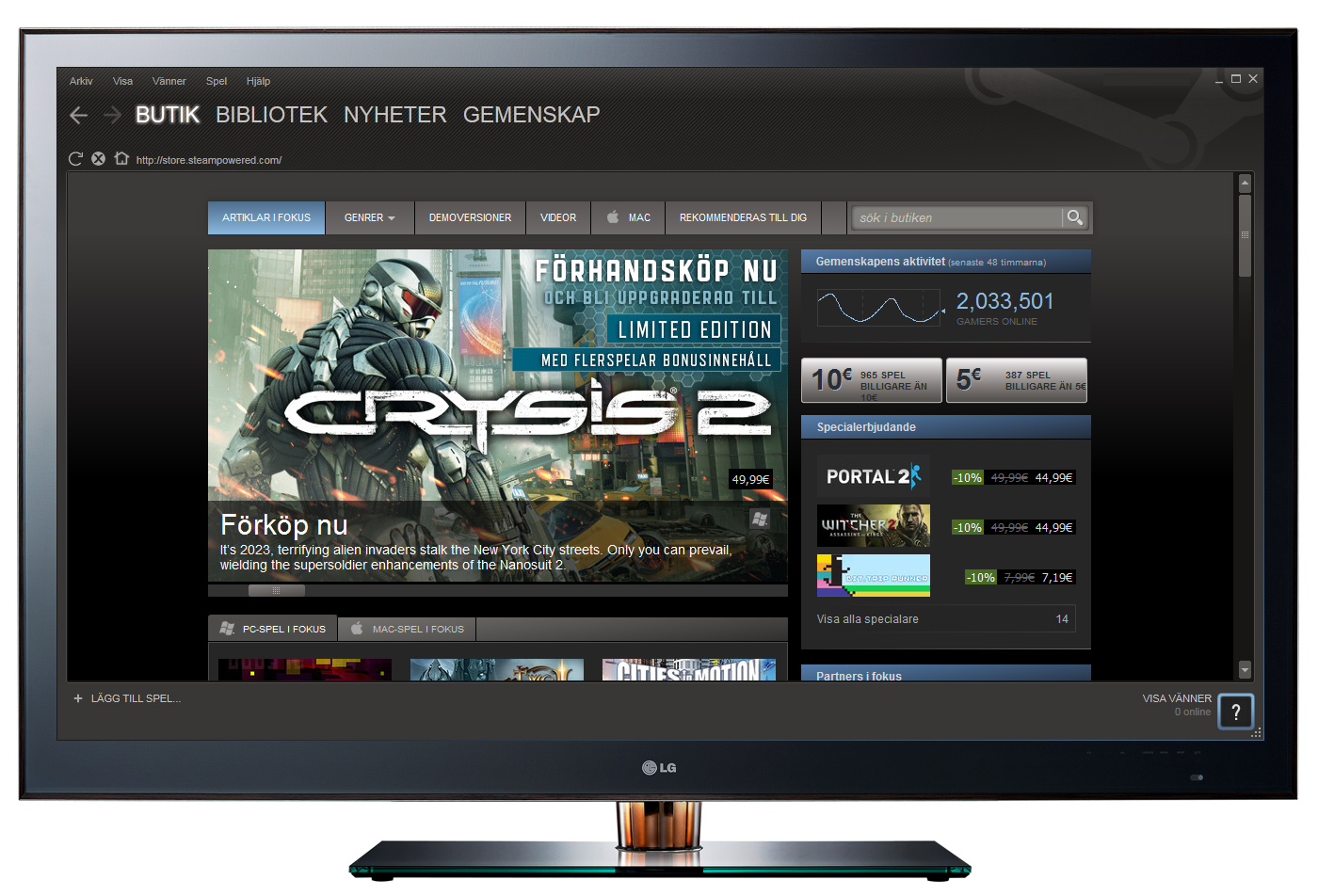“Our partners and customers have asked us to make Steam available in more places. With the introduction of Steam on the Mac, and soon in Portal 2 on the PS3™, we’ve done just that,” säger Doug Lombardi, vice vd på Valves marknadsavdelning. “With big picture mode, gaming opportunities for Steam partners and customers become possible via PCs and Macs on any TV or computer display in the house.”