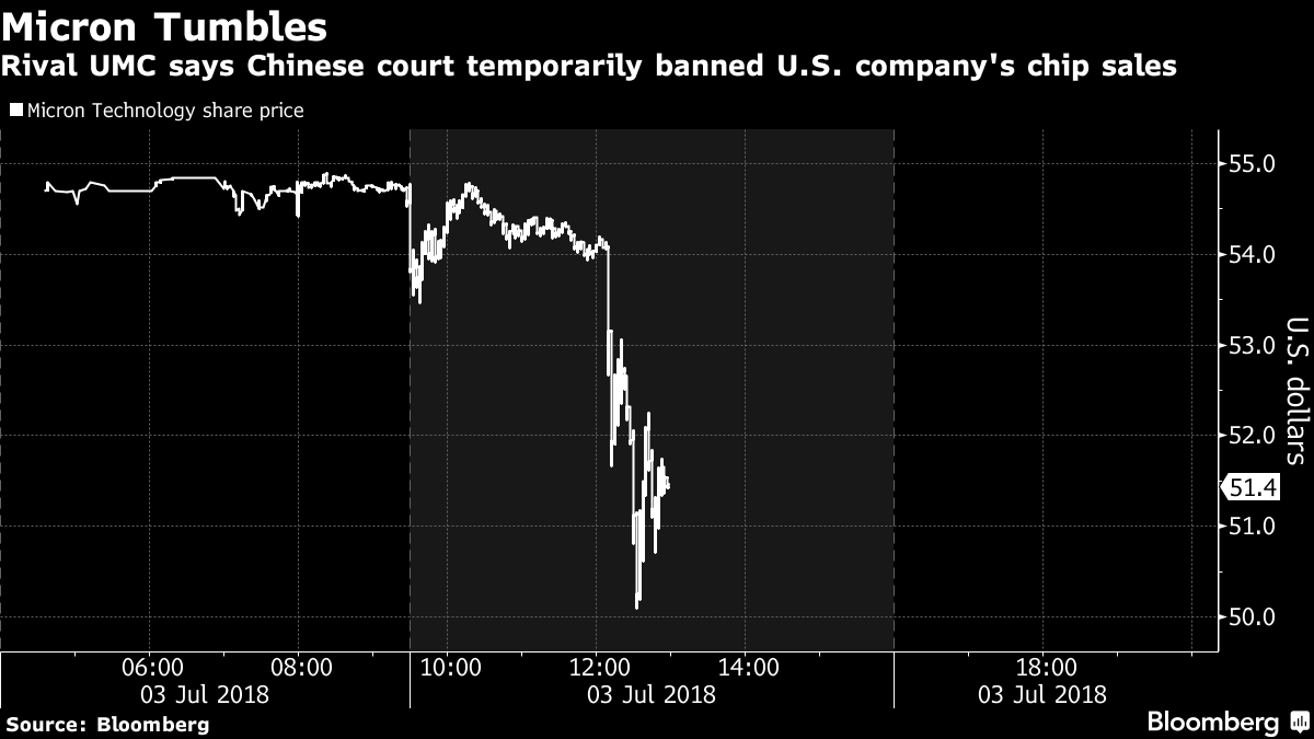 Detta resulterade i att Microns aktievärde dök med så mycket som åtta procent under tisdagen. Kina är världens största halvledarmarknad och stod för omkring 50 procent av amerikanska Microns inkomst under räkenskapsåret 2017.