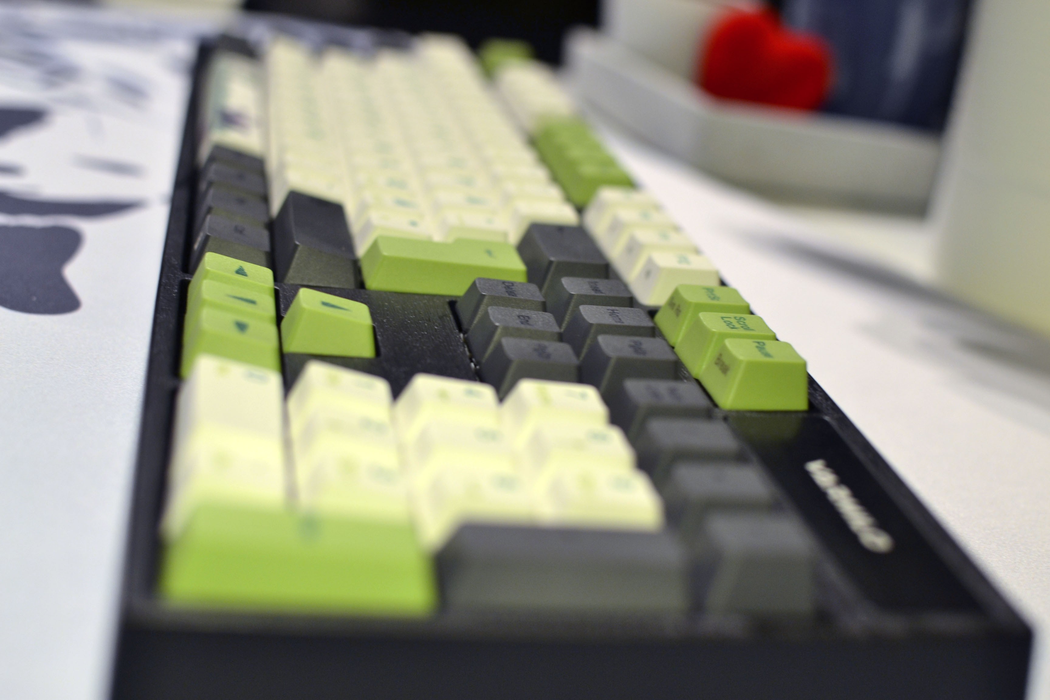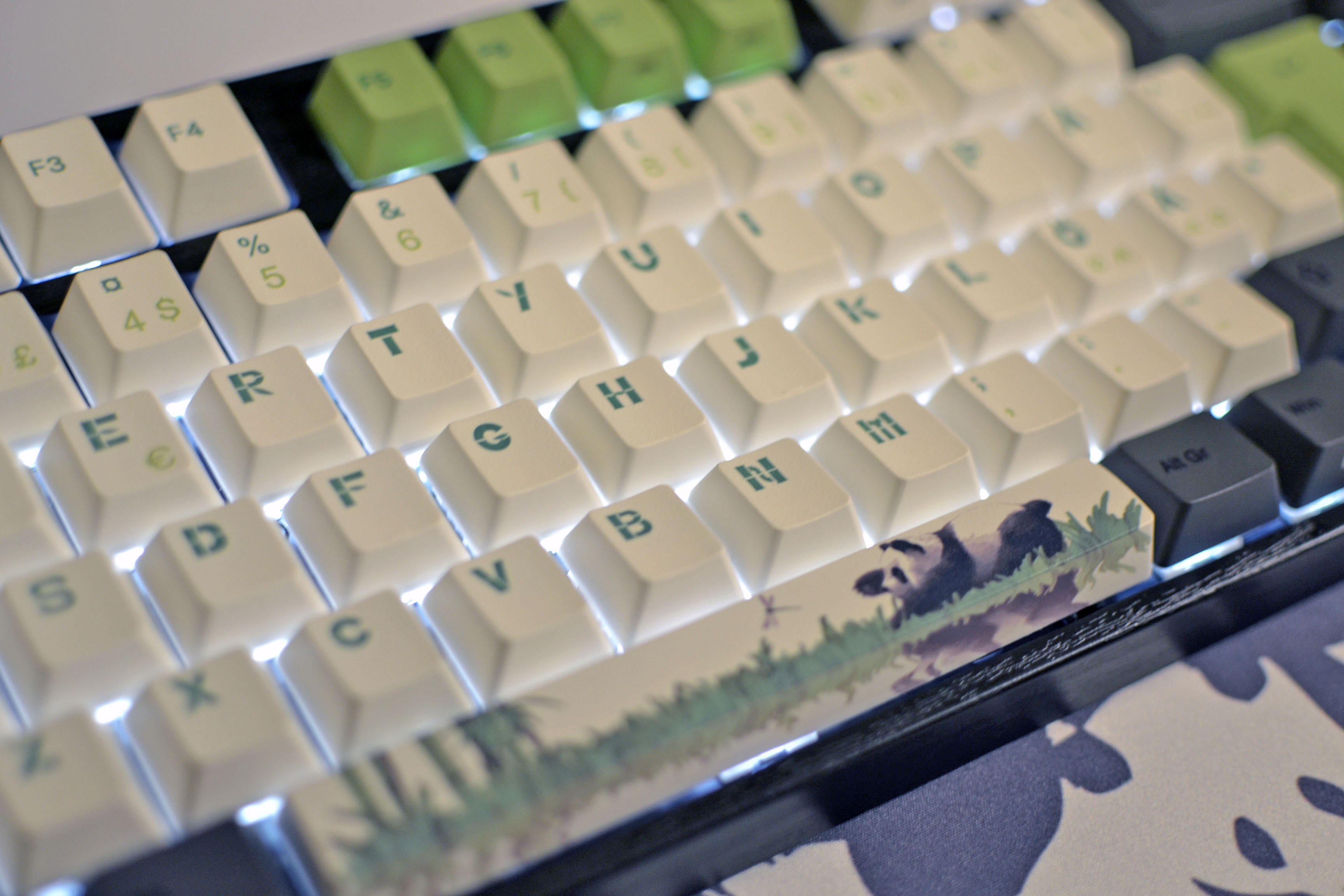 På ovansidan av brytarlocken så är inskriften färgsublimerad, som även det är en väldigt påkostad metod och att föredra över exempelvis laserinristning. Färgsublimering innebär att man permanent “fläckar” ned brytarlocket med en färg, och processen kräver en väldigt hög temperatur; ABS-plast smälter i den temperaturen så det är endast möjligt med PBT.