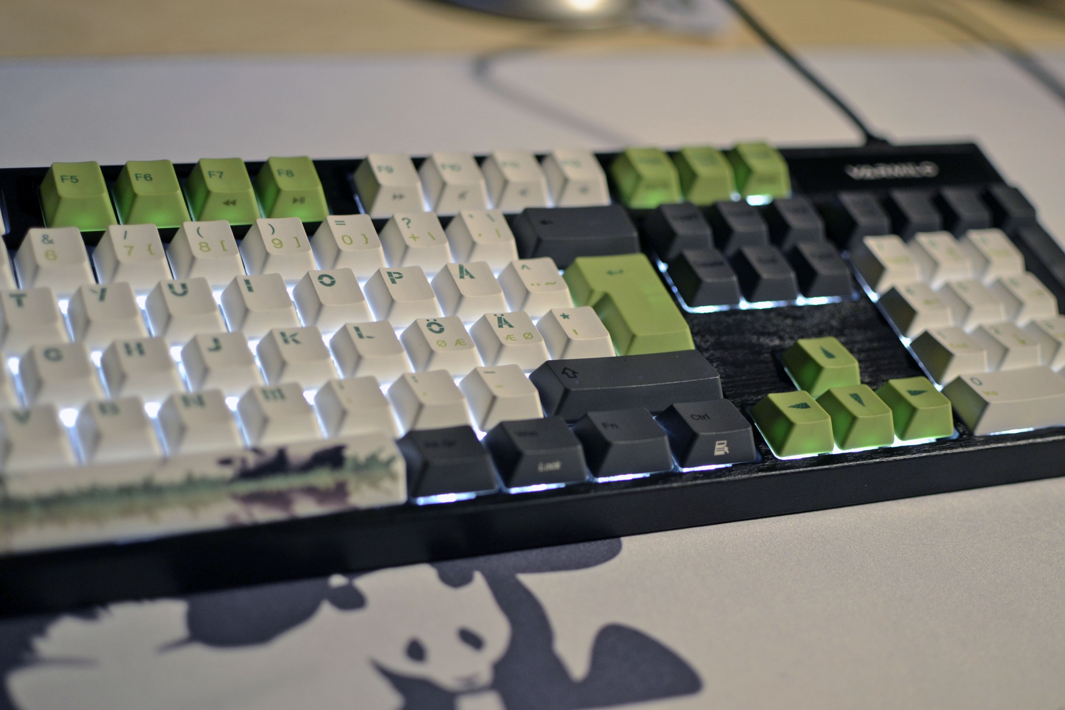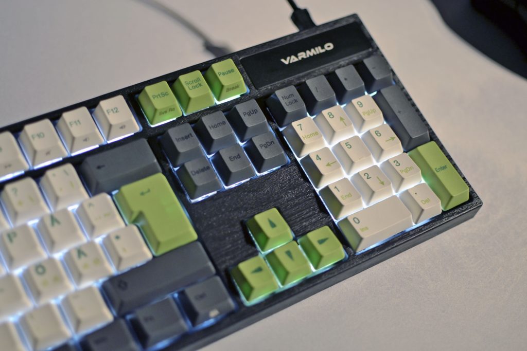 Vi var väldigt sugna på att få komma igång och få använda Varmilo MA105C med de nya Sakura Pink-brytarna. Brytarna ska likna Cherry MX Red-brytare i känslan, och vi märkte ganska snabbt att de faktiskt var mycket mer mjuka i sin linjära försänkning. Vi har aldrig stött på en så mjuk brytare, vi märker knappt av att det är en brytarstam som går ned längs med skenor – nästan som att trycka ned en tangent över luft med motstånd. Vi hittar dock ett fåtal av tangenterna i vårt exemplar som har en liten annorlunda känsla, där de “skrapar” lite och vi känner av skenan, men det påverkar inte upplevelsen på något sätt i det stora hela.
