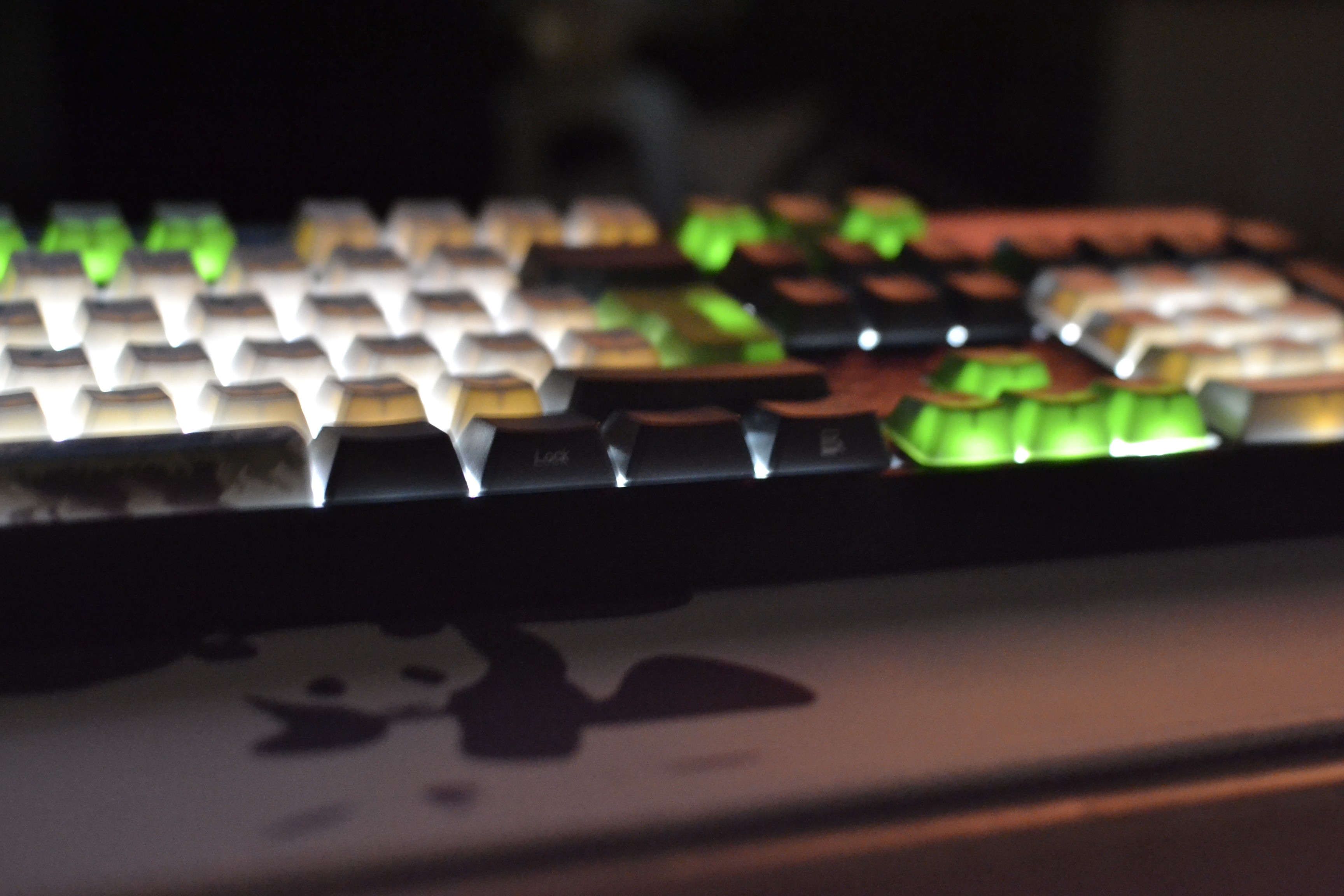 Själva belysningen lyser inte igenom inskriften på brytarlocken, så det hjälper oss inte att hitta specifika tangenter i mörker. Något som belysningen däremot lyser igenom är brytarlocken på alla tangenter som inte är mörkgråa eller scroll lock av någon anledning. Vi vet inte om det är tilltänkt att fungera så, men det är bra att ha i åtanke.