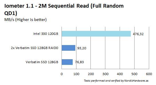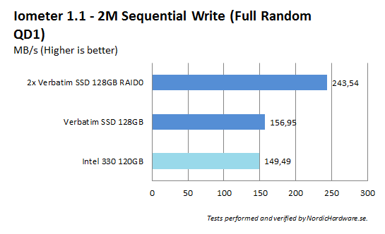Direkt i första testet ser vi att Verbatim har svårt att hänga med när det kommer till skrivningar av större filer. Inte ens med två enheter i RAID 0 kommer man i närheten av Intel 330 vars Sandforce-kontroller stormtrivs med komprimerbar data som detta.