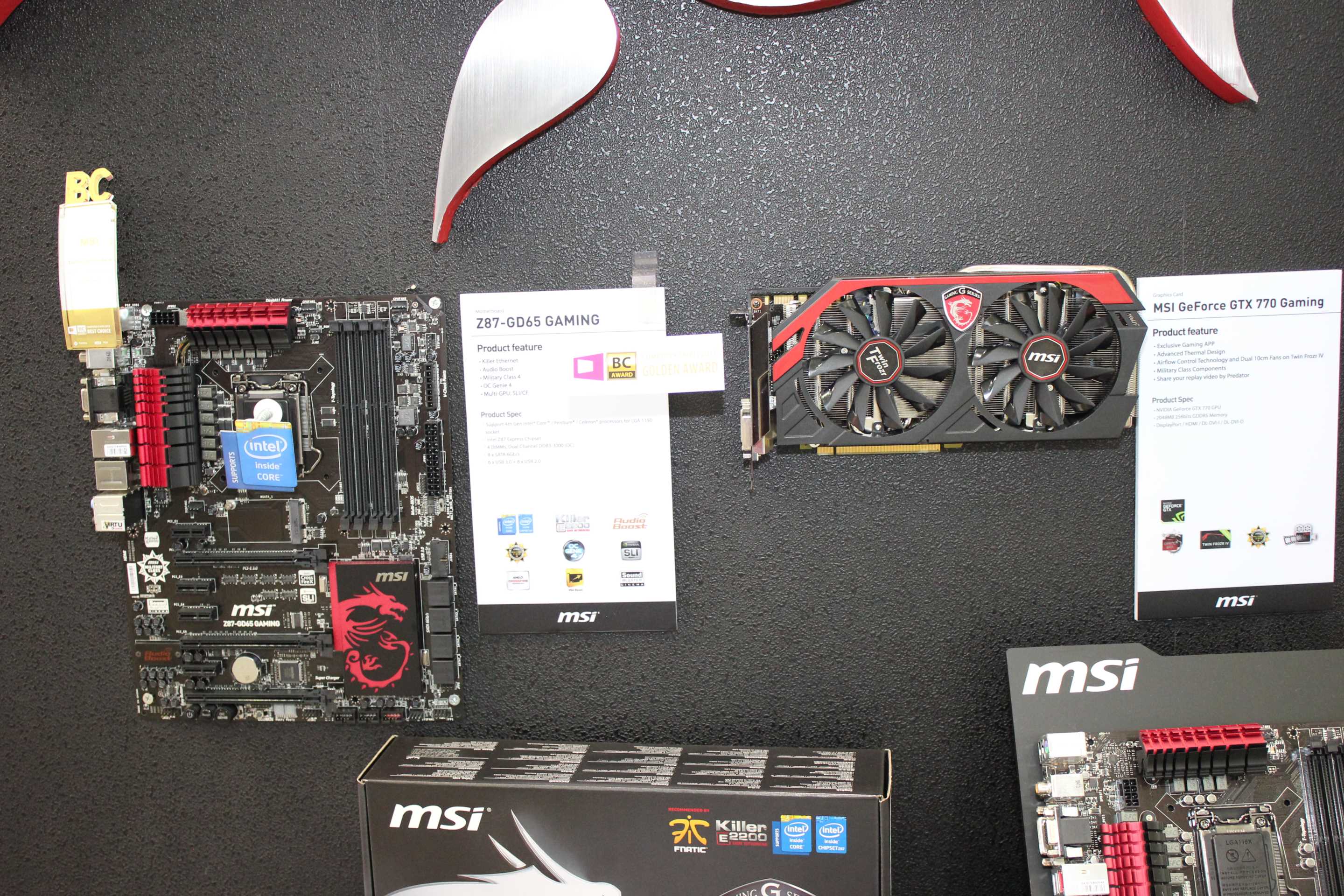 Ur den spelhörna MSI upprättat på mässgolvet inleder vi med ett exempel på moderkort anpassade för datorspelare. Modellen heter Z87-GD65 Gaming och erbjuder utöver tre PCI Express X16 för konfigurationer med flera grafikkort även på nätverkskretsen E2200 från Killer, som är utvecklad för spelscenarion och tänkt att förbättra nätverksprestanda under online- eller LAN-spelande.