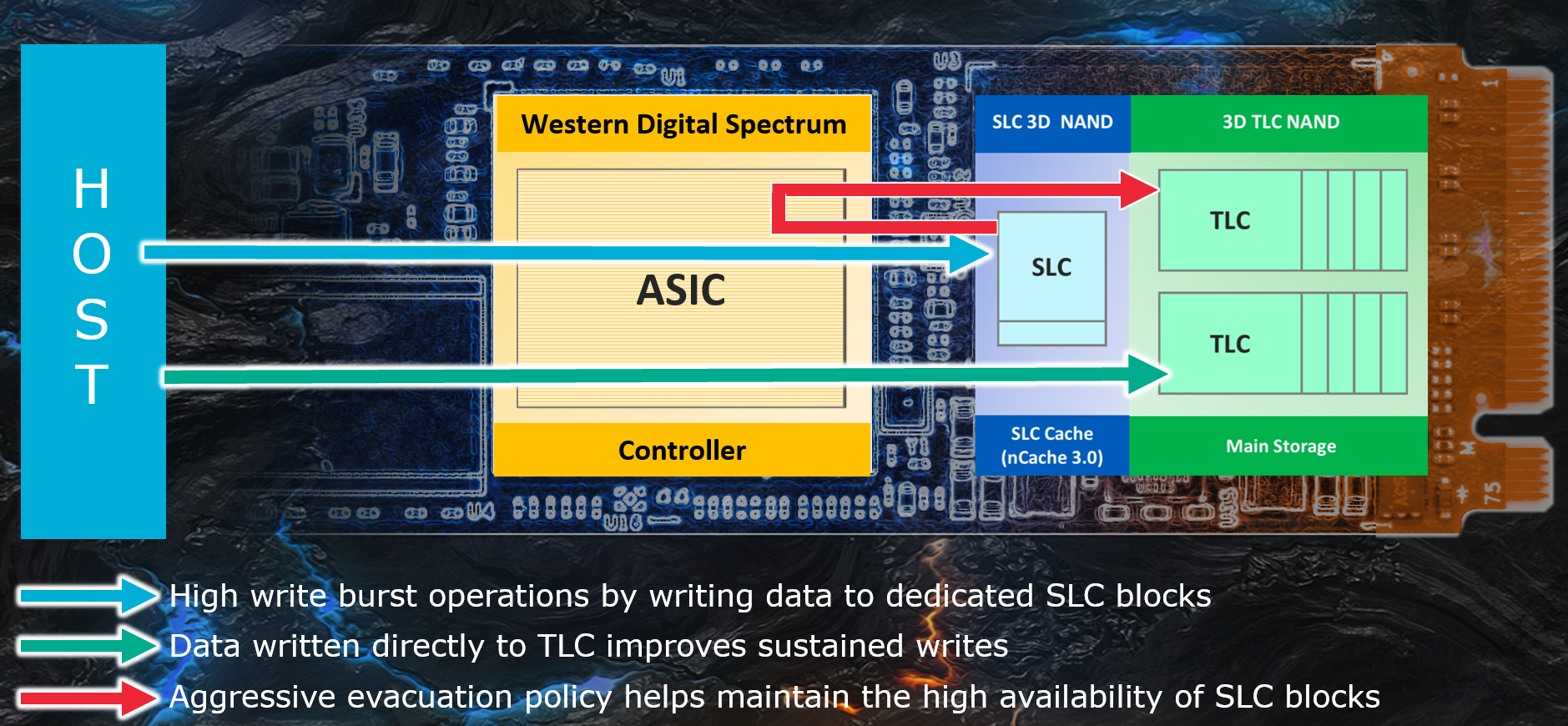 Med dagens 3D-TLC är skrivprestandan hos TLC betydligt bättre och livslängden är också bättre. Det betyder att man nu inte längre behöver trycka in alla skrivningar i SLC-cachen först. Det betyder också att man nu kan dumpa SLC till TLC oftare, vilket ger ökad WA, men också bättre prestanda. När SLC-cachen blir full kommer skrivningar istället att gå direkt till TLC vilket ger bättre skrivprestanda. Detta kommer vara bra när man gör stora sekventiella skrivningar eller väldigt tung belastning. Det verkar också som att WD använder en fast storlek på sin cache. Storleken varierar givetvis med storleken på enheten. 250GB verkar ha ungefär 3,5 GB, 500 GB ungefär 7 GB och 1 TB ungefär 14 GB. Vi har försökt bekräfta detta hos WD, men inte fått något definitivt svar.