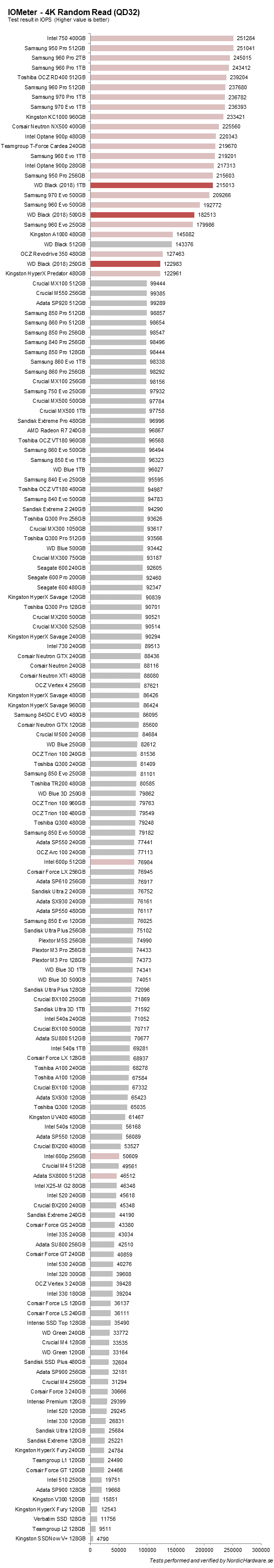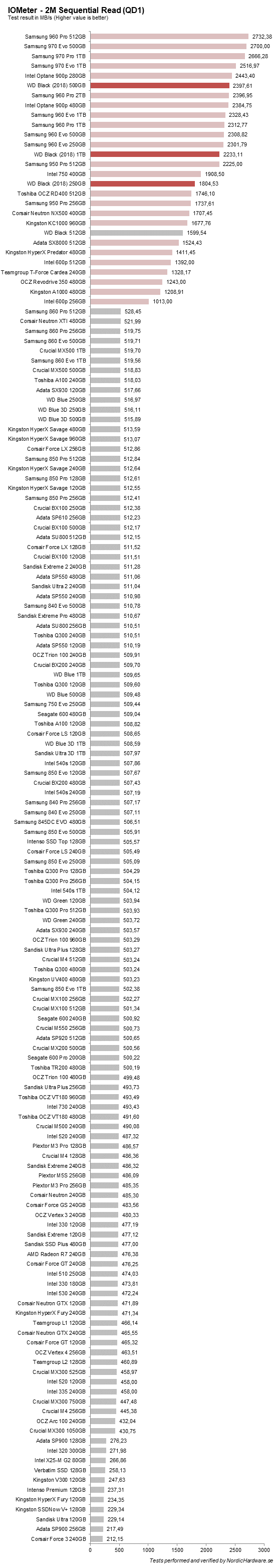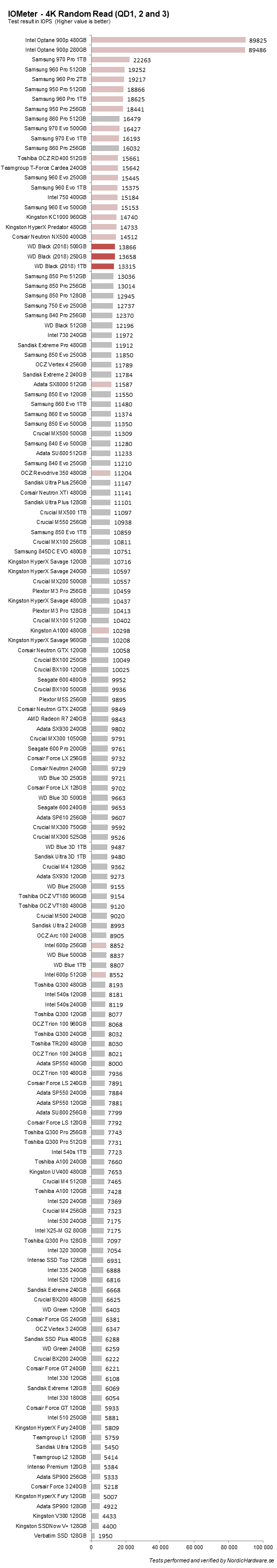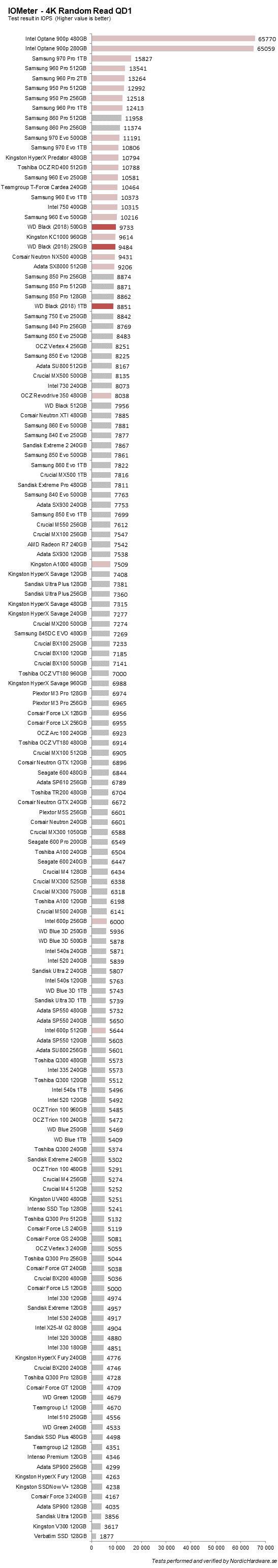 Sänker vi QD ännu mer och bara tittar på QD1 slumpmässig läsning ser vi återigen att WD Black är lite efter de snabbaste NVMe enheterna. Till och med några SATA-enheter från Samsung lyckats springa förbi.