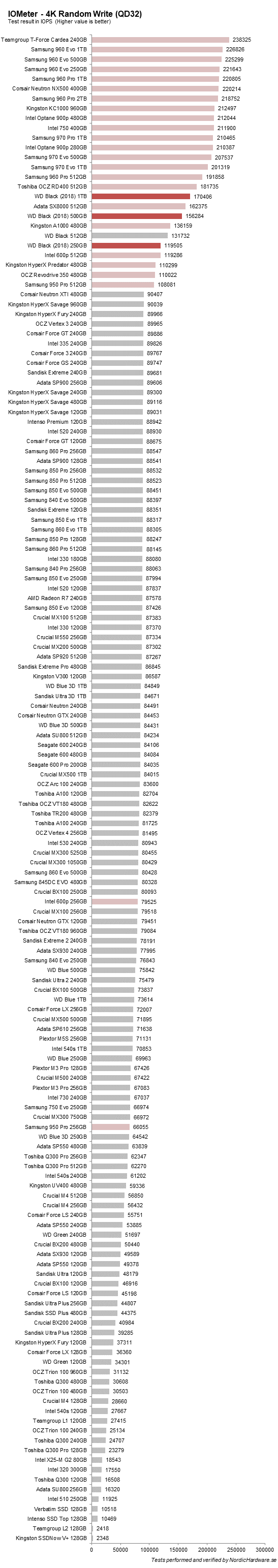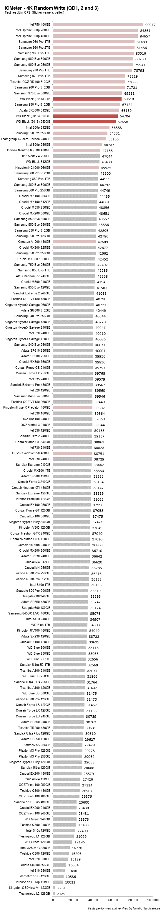 Hög QD slumpmässig prestanda är egentligen rätt ointressant då det är ytterst sällan som ens tungt belastade servrar kommer upp i så här hög QD. Det är mest ett sätt för företag att klappa sig på bröstet och då vill vi ju se om det stämmer. WD påstår att enheten kan leverera uppåt 500 000 IOPS och det är vi inte ens i närheten av. Frågan är hur många trådar man måste köra för att nå upp till de siffrorna? Om vi jämför de andra enheterna så ligger WD Black lite längre ner och är oftast långsammare än sina närmaste konkurrenter.