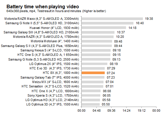 I vårt batteritest där vi loopar ett filmklipp med 50% ljusstyrka klarar sig HTC 8X i 7 timmar och 24 minuter vilket är fullt godkänt då detta är ett test som missgynnar LCD. Jämför vi med Xperia S får vi ett 20 procent bättre resultat trots att batteriet inte är mycket större. Vi har inte haft några problem med att batteriet tagit slut under vårt dagliga användande, och då har vi kört på högsta ljusstyrka trots att medium har varit tillräckligt. Det är fortfarande en dags aktivt användande som gäller men det är fullt möjligt att få ut både två och tre dagar om man använder telefonen sparsamt. Det går förmodligen att få ut mer batteritid om autojusteringen av ljusstyrkan blir lika välfungerande som i One-serien.