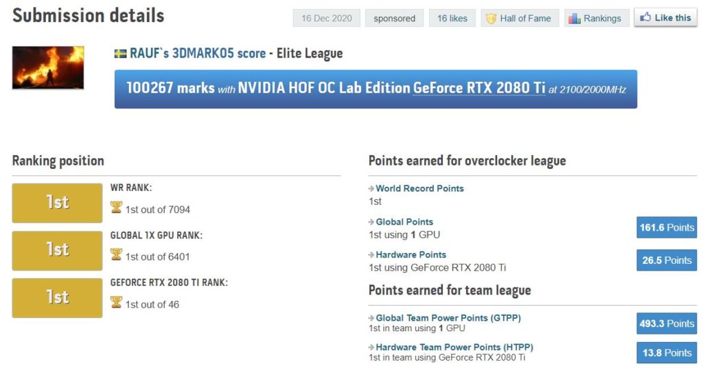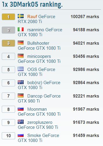 Det senaste världsrekordet i 3DMark05 sätts av ingen annan än svenske Tobias “Rauf” Bergström. Rauf har med hjälp av flytande kväve lyckats pressa en 16-kärnig AMD Ryzen 9 5950X till brutala 6 050 megahertz. Detta gjordes tillsammans med ett moderkort i form av Asus ROG Crosshair VIII Dark Hero, ett luftkylt och överklockat RTX 2080 Ti samt DDR4-minne med en hastighet på 2 300 MHz.