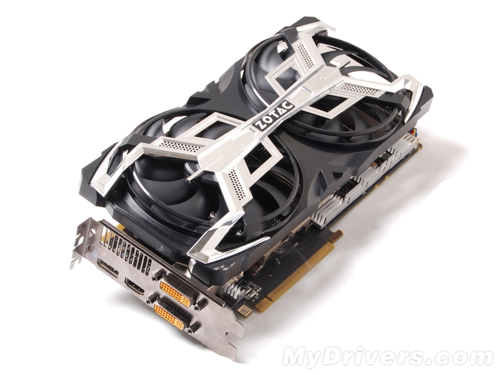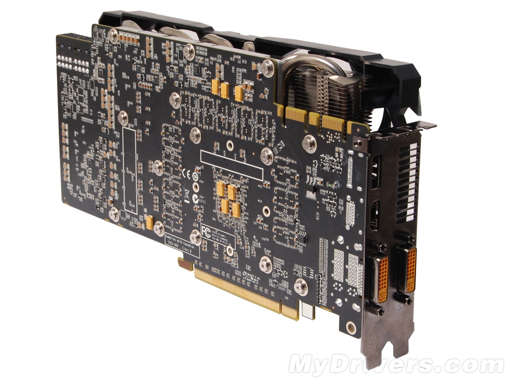Förutom en överdimensionerad spänningsdel har Zotac GeForce GTX 580 Extreme Edition även en kylare som bokstavligt talat står ut från mängden. En värmefördelande fläns fästs först på minneskretsar och mosfets medan en mäktig aluminiumfläns med sex stycken 6 mm värmeledningsrör står för GPU-kylningen. På kylflänsen hittar vi inte en, utan två stycken, 120mm fläktar som ska hålla temperaturerna nere. I expansionsplåten hittar vi dubbla DVI-I utgångar samt en HDMI och en DisplayPort-utgång.