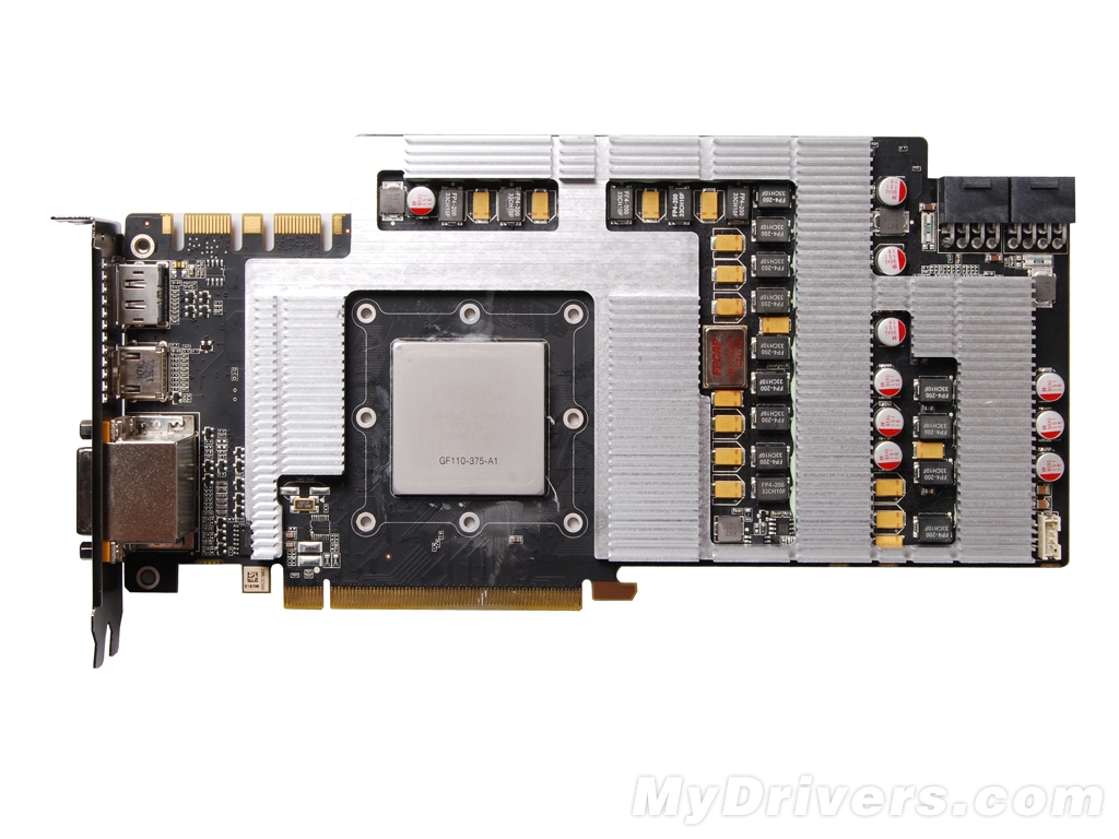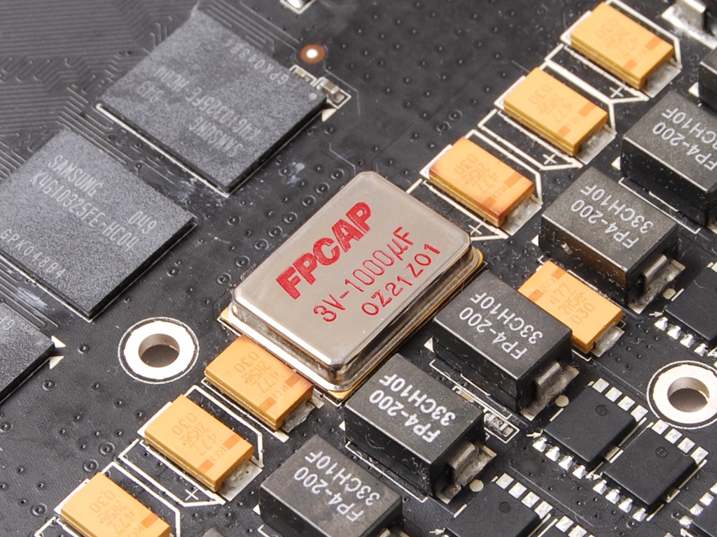 Totalt hittar vi 18 faser på kortet varav 16 går till GPU och de övriga 2 till kortets GDDR5-minneskretsar. Man varvar tantalum-kondensatorer med kretskondensatorer och induktorer. Spänningsdelen ska vara kapabel att förse grafikkretsen med upp till 500 watt, om så skulle önskas. Med två 8-pins strömkontakter är den maximala strömförbrukningen dock begränsad till runt 450 watt, vilket förhoppningsvis räcker för de flesta.
